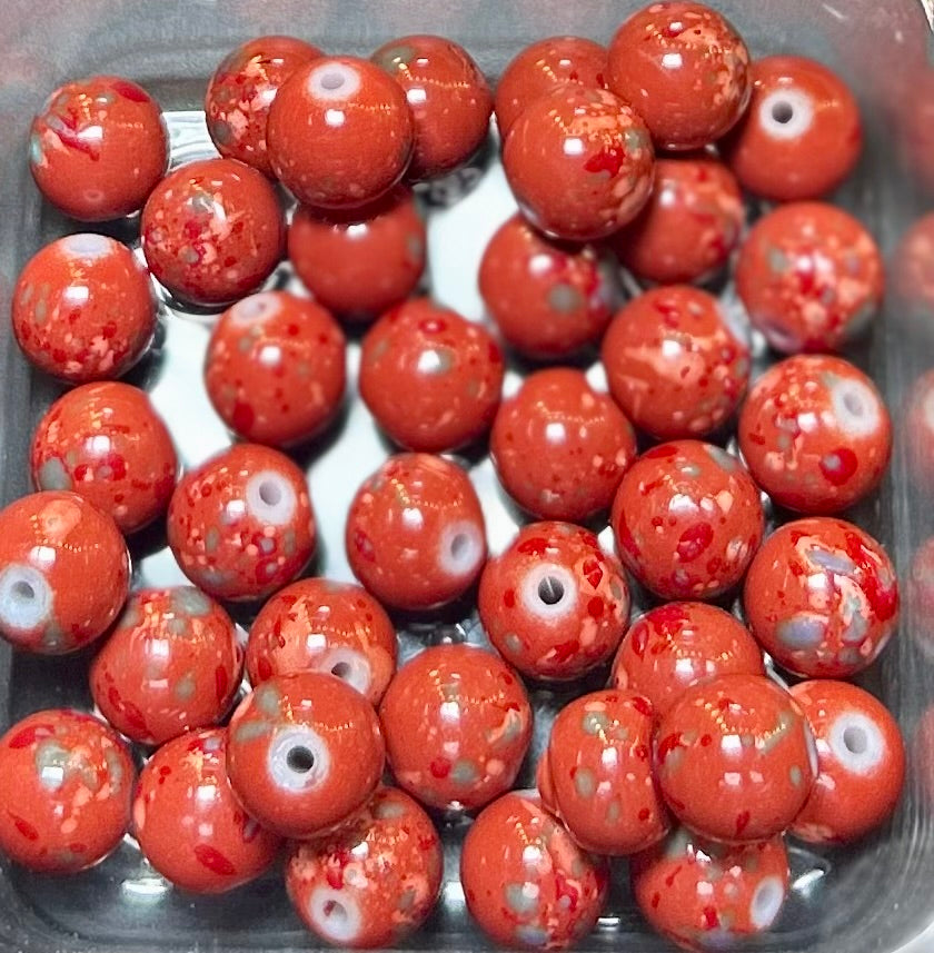 - Design: Bold red beads with a captivating gray and peach splatter pattern, perfect for adding a creative flair to your designs