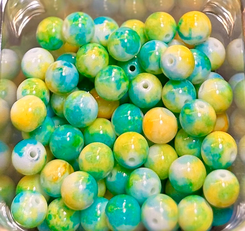 - Design: Gorgeous blue and yellow marble pattern, each bead showcasing a unique blend of colors and swirls