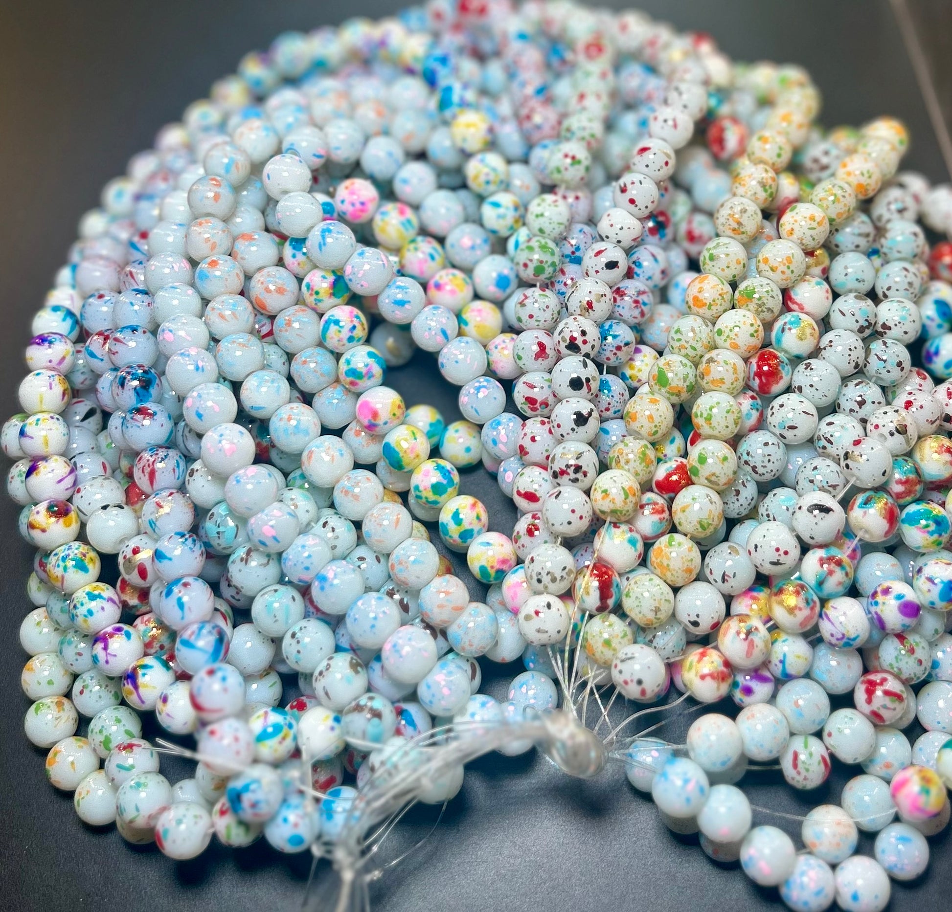 • Design: Unique confetti design with a mix of bright, playful colors scattered throughout each bead, adding a joyful and dynamic element to your creations